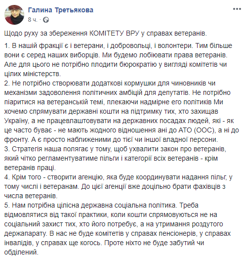 "Не нужно создавать дополнительные кормушки для чиновников или механизмы удовлетворения политических амбиций для депутатов. Не нужно пиариться на ветеранской теме", - написала Третьякова.