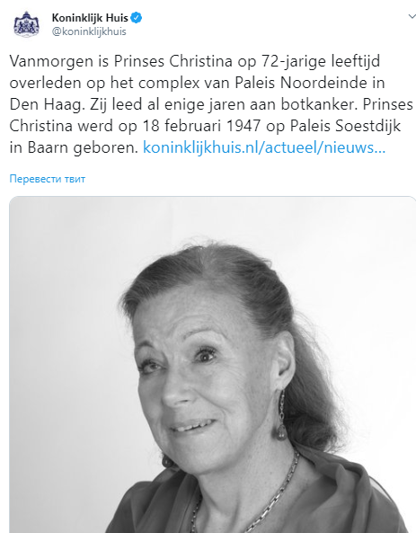 "Мы опечалены смертью нашей дорогой сестры и тети. Кристина была яркой личностью с большим сердцем", - отмечается в сообщении королевской семьи в Twitter.