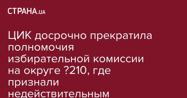 Центральная избирательная комиссия досрочно прекратила полномочия окружной избирательной комиссии на округе № 210 (Черниговская обл., центр - Прилуки). Об этом в Facebook сообщает пресс-служба ЦИК.