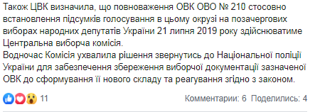 "Следовательно, ЦИК установила грубое нарушение указанной окружной избирательной комиссией Конституции и законов Украины, которое заключается в бездействии по выполнению им определенного Законом Украины "О выборах народных депутатов Украины" и решением Комиссии от 15 августа 2019 обязанности установить итоги голосования в ОВО № 210 с учетом соответствующего судебного решения, и досрочно прекратила полномочия всего ее состава", - сказано в сообщении.