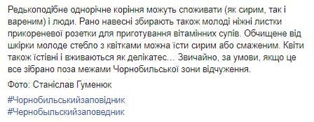 "Очищенный от кожуры молодой стебель с цветками могут есть и люди - сырым или жареным. Цветы также съедобны и употребляются как деликатес. Конечно, при условии, если это все собрано за пределами Чернобыльской зоны отчуждения", - уточнили в заповеднике.