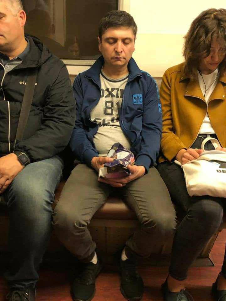 Пользователей Facebook насмешило фото, где человек, довольно сильно похожий на президента Владимира Зеленского, едет в вагоне киевского метрополитена. Пост с фото в Facebook опубликовал пользователь Дмитрий Коваленко.