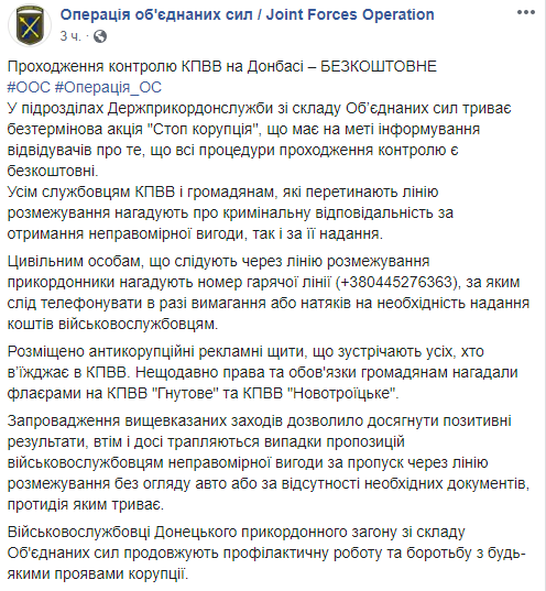 "В подразделениях Госпогранслужбы из состава Объединенных сил продолжается бессрочная акция "Стоп коррупция", имеющая целью информирования посетителей о том, что все процедуры прохождения контроля являются бесплатными. Всем служащим КПВВ и гражданам, которые пересекают линию разграничения, напоминают об уголовной ответственности как за получение неправомерной выгоды, так и за ее предоставление", - сказано в сообщении.