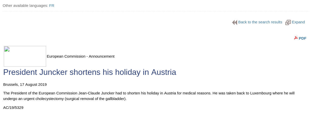 "Президент Еврокомиссии Юнкер сократил свой отпуск в Австрии из-за медицинских причин. Его переправили в Люксембург, где ему будет срочно проведена холецистэктомия (хирургическое удаление желчного пузыря)", - сообщили в Еврокомиссии.