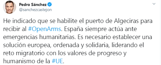 "Я поручил порту Альхесирас быть готовым к приему судна Open Arms", - сказано в сообщении.