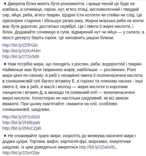 • Источники белка должны быть разнообразными. Лучше пусть это будет не колбаса, а чечевица, орехи, нут, мясо птицы, кисломолочный и твердый сыры, яйца, рыба, мясо животных. Ежедневно есть котлеты или стейки не следует. Это ускоряет старение и повышает риск рака. Жирная морская рыба не обязательно должна быть дорогой, достаточно скумбрии. В ней есть и омега-3 жирные кислоты, и белок. Добавляйте чечевицу в супы, отварной нут или яйца - в салаты, в качестве десерта берите орехи. Это наполнит рацион белком.