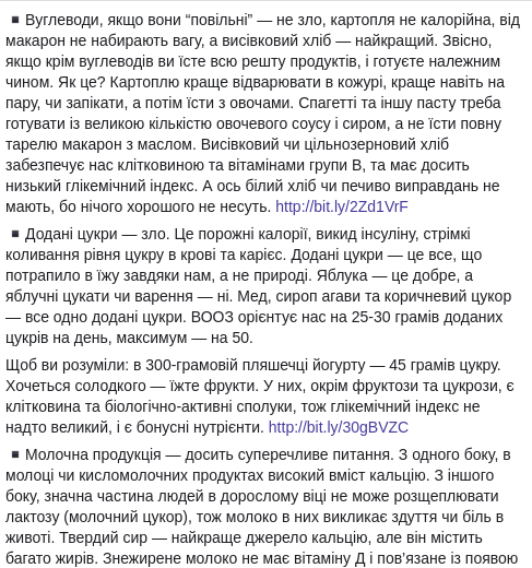• Добавленные сахара - зло. Это пустые калории, выброс инсулина, стремительные колебания уровня сахара в крови и кариес. Добавленные сахара - это все, что попало в пищу благодаря нам, а не природе. Яблоки - это хорошо, а яблочные цукаты или варенье - нет. Мед, сироп агавы и коричневый сахар - все равно добавленные сахара. ВОЗ ориентирует нас на 25-30 граммов добавленных сахаров сахаров в день, максимум - на 50. А 300-граммовой бутылочке йогурта - 45 граммов сахара. Хочется сладкого - ешьте фрукты. В них, кроме фруктозы и сахарозы, является клетчатка и биологически активные соединения, поэтому гликемический индекс не слишком большой, и есть бонусные нутриенты.