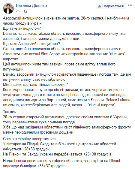 Наталья Диденко уточнила, что 20 августа Азорский антициклон достигнет своими волнами и Украины, поэтому будет преобладать сухая солнечная погода. Однако над западными областями хвост северного атмосферного фронта принесет периодические грозовые дожди.