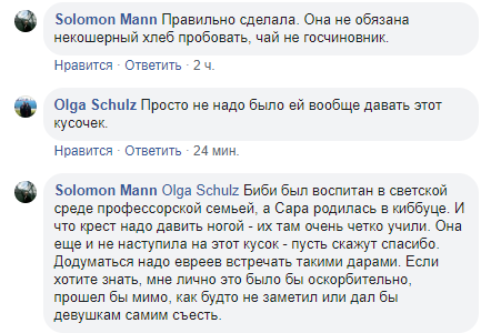 "Биби (так называют Нетаньяху в Израиле - Ред.) был воспитан в светской среде профессорской семьей, а Сара родилась в киббуце (сельскохозяйственная комунна в Израиле - Ред.). Она еще и не наступила на этот кусок - пусть скажут спасибо. Додуматься надо евреев встречать такими дарами. Если хотите знать, мне лично это было бы оскорбительно, прошел бы мимо, как будто не заметил или дал бы девушкам самим съесть", - отметил Манн.