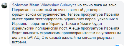 "Подписан незаметный но очень важный договор о юридическом сотрудничестве. Теперь прокуратура Израиля имеет право экстрадировать украинских воров, уехавших в Израиль - обратно в Украину. Также в Умани будет израильский полицейский пост. А еще прокуратура Израиля будет помогать украинским правоохранителям по уголовным делам в БАГАЦ (Верховный суд Израиля - Ред.). Это самый важный на сегодня результат встречи", - написал Манн в Facebook.