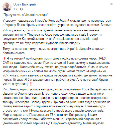 "Я не готов приезжать, пока глава Офиса президента руководит НАБУ, САП и судебной системой. При президенте Зеленском в суды звонят другие люди. У меня нет "барышевских" или "соломенских" судов, нет такого "Богдана" или "Сытника", поэтому предпочитаю находиться в стране, где закон и право - не пустой звук. Я бы с удовольствием прибыл на суд, но не готов участвовать в судилище", - написал Дмитрий Вовк.