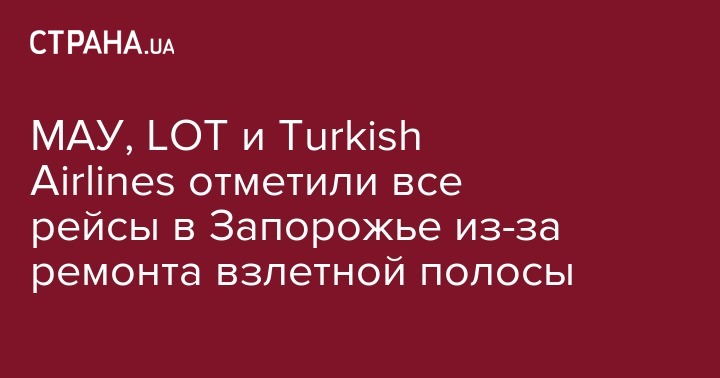 Все рейсы авиакомпаний "Международные авиалинии Украины", LOT и Turkish Airlines в аэропорт "Запорожье" будут отменены со 2 сентября по 15 октября в связи с ремонтом там взлетно-посадочной полосы. Об этом сообщает ЦТС со ссылкой на заявление авиаперевозчиков.
