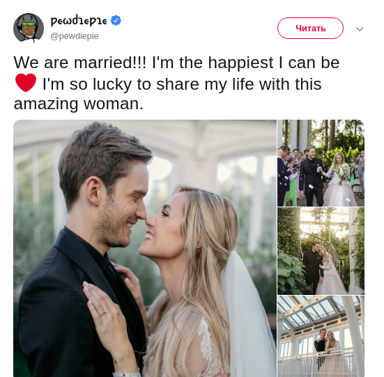 Самый известный видеоблогер в мире Феликс Чельберг, он же PewDiePie, объявил о том, что он женился. Миссис Чельберг стала Марция Бизоньин (Marzia Bisognin). Пара долго была в отношениях. Фото со свадьбы PewDiePie опубликовал в Twitter.