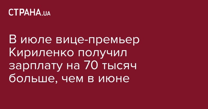 Вице-премьер-министр Украины Вячеслав Кириленко в июле получил зарплату 113,1 тыс. грн, что почти на 70 тыс. грн больше, чем в июне. Об этом пишут "Украинские Новости"