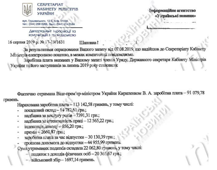 В июле Кириленко было начислено 113 143 гривны, из них должностной оклад - 14 783 гривны, надбавка за выслугу лет - 7 391 гривны, надбавка за интенсивность труда - 12 565 гривен, индексация - 656 гривен, премия - 2 661 гривну, отпускные - 75 086 гривен.