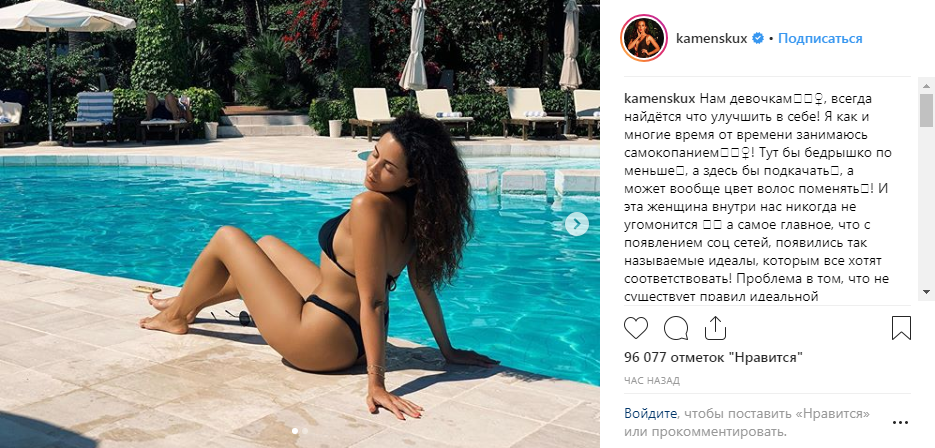На этот раз Каменских сфотографировалась у бассейна. На ней черный открытый купальник. На фото певица нежится на солнце. Благодаря удачным позам в выгодном свете предстают формы Насти: подтянутый живот, плавная линия талия и спортивные ягодицы.