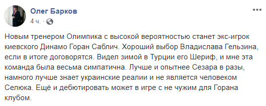"Новым тренером «Олимпика» с высокой вероятностью станет экс-игрок киевского «Динамо» Горан Саблич. Хороший выбор Владислава Гельзина, если в итоге договорятся. Видел зимой в Турции его «Шериф», и мне эта команда была очень симпатична.
