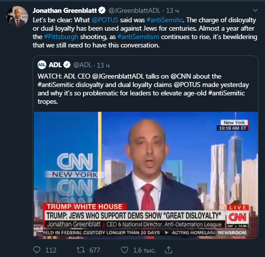 "Будем откровенны: сказанное президентом носит антисемитский характер. Обвинение в нелояльности или двойной лояльности использовалось против евреев на протяжении веков. Спустя почти год после стрельбы в синагоге Питтсбурга, когда антисемитизм продолжает расти, вызывает недоумение необходимость в этом разговоре", - написал Джонатан Гринблатт.