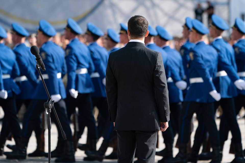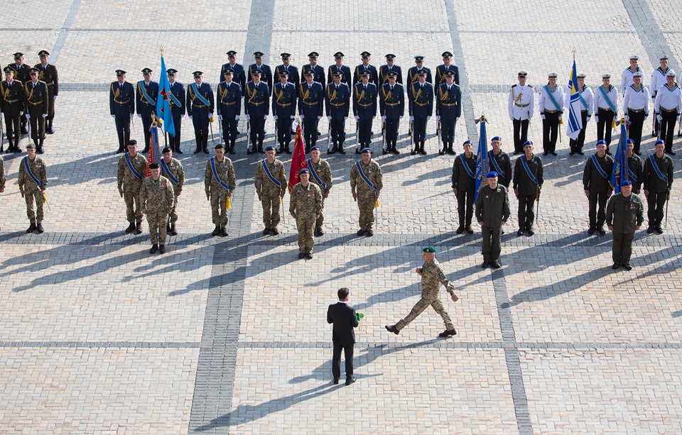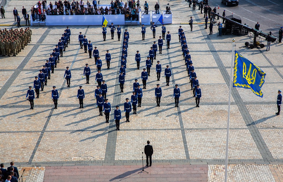 Президент прошел перед школьниками и военными, также сфотографировавшись с детьми и большим флагом. Часть правоохранителей в честь праздника также выстроились в форме тризубца и прошла маршем.