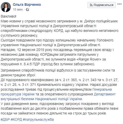 Как сообщала в конце июля "Страна", высокопоставленный чиновник Виталий Глуховеря 12 сентября 2018 года  незаконно дал команду сотрудникам спецназа КОРД задержать патрульных в Днепропетровской области, которые остановили водителя "Range Rover" за нарушение п. 8.4.бы ПДД (проезд без остановки запрещен), что попало на видео.