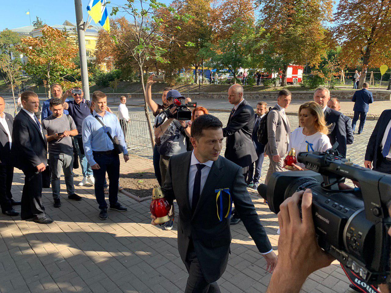 09:14 На Грушевского подъехал президент. Журналисты попросили у Зеленского комментарий, он на секунду остановился, повернулся к прессе и поздравил их с Днем независимости на украинском языке.