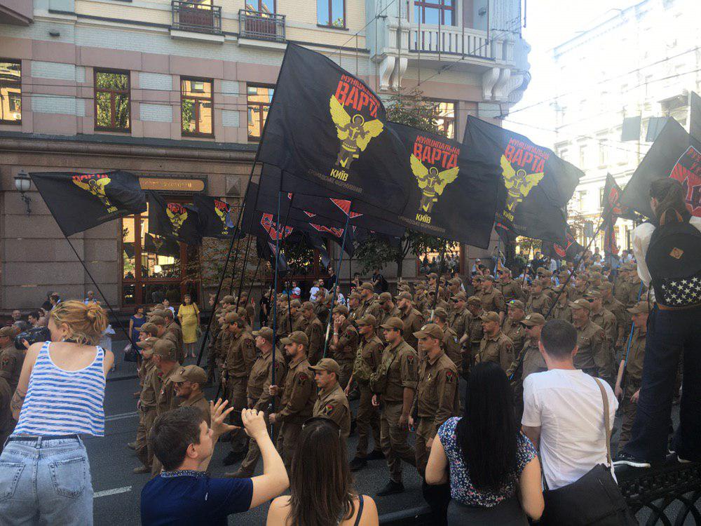 12:20 В колонне Марша националистов следующее размещение: за матерями и детьми погибших участников АТО идет колонна города Киев. За ним - в сером камуфляже представители Муниципальной варты (скорее всего, это представители С14, переодетые в форму Варты - Ред.), за ними батальон "Киевская Русь", потом "Айдар". Потом - в колонне ветераны 93 бригады.