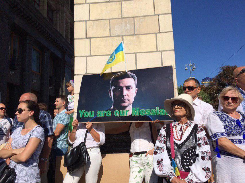 11:27 На Крещатик во время Зе-парада пришли люди с плакатом 'You are our Messiah' ("Ты - наш мессия"), на котором изображен Зеленский. В соцсетях иронизируют, что футболист Месси (игра слов "Месси - мессия") выглядит не так.