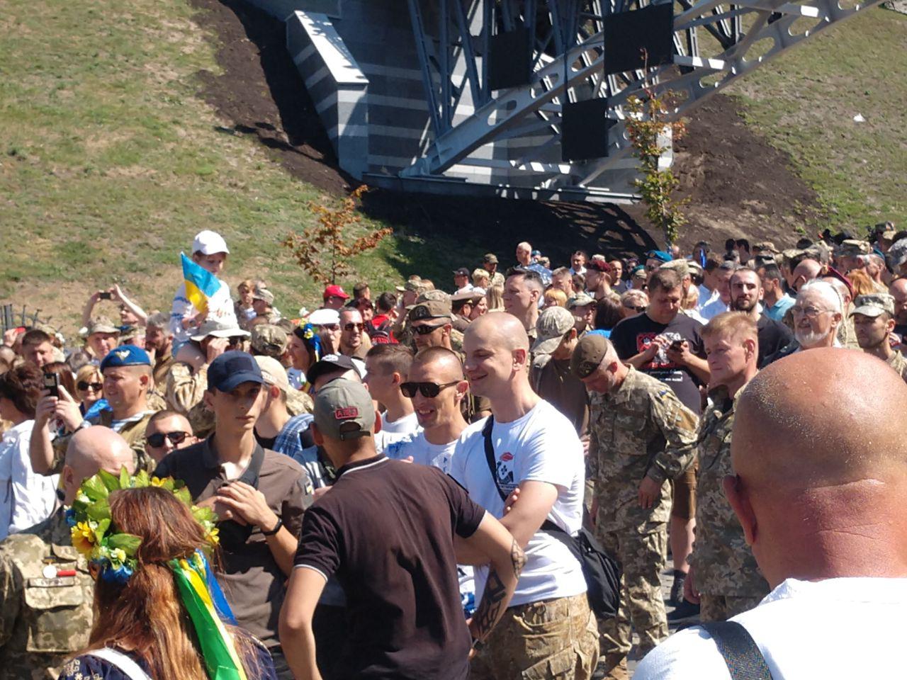Другая группа - во главе с участниками АТО из Киева - направились вверх по направлению к Институтской. Там они выстроились на аллее героев Небесной сотни и двинулись вверх по направлению к Институтской. Там они остановились у монумента погибшим на Майдане.