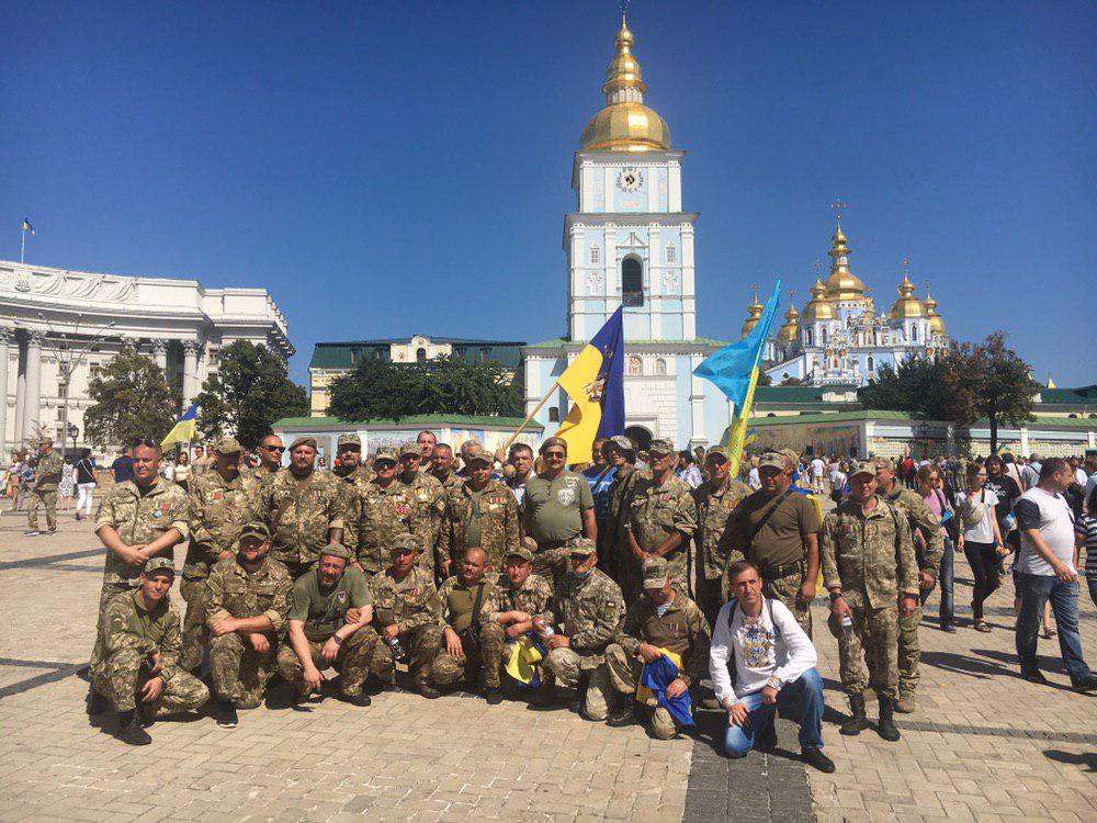 14:00 Похоже, мероприятие здесь и закончится. Собравшиеся кучкуются, делают совместные снимки. Единого руководства у собравшихся не просматривается. Теперь на Михайловской - еще один молебен за упокой погибших защитников АТО. От организаторов марша ветеранов