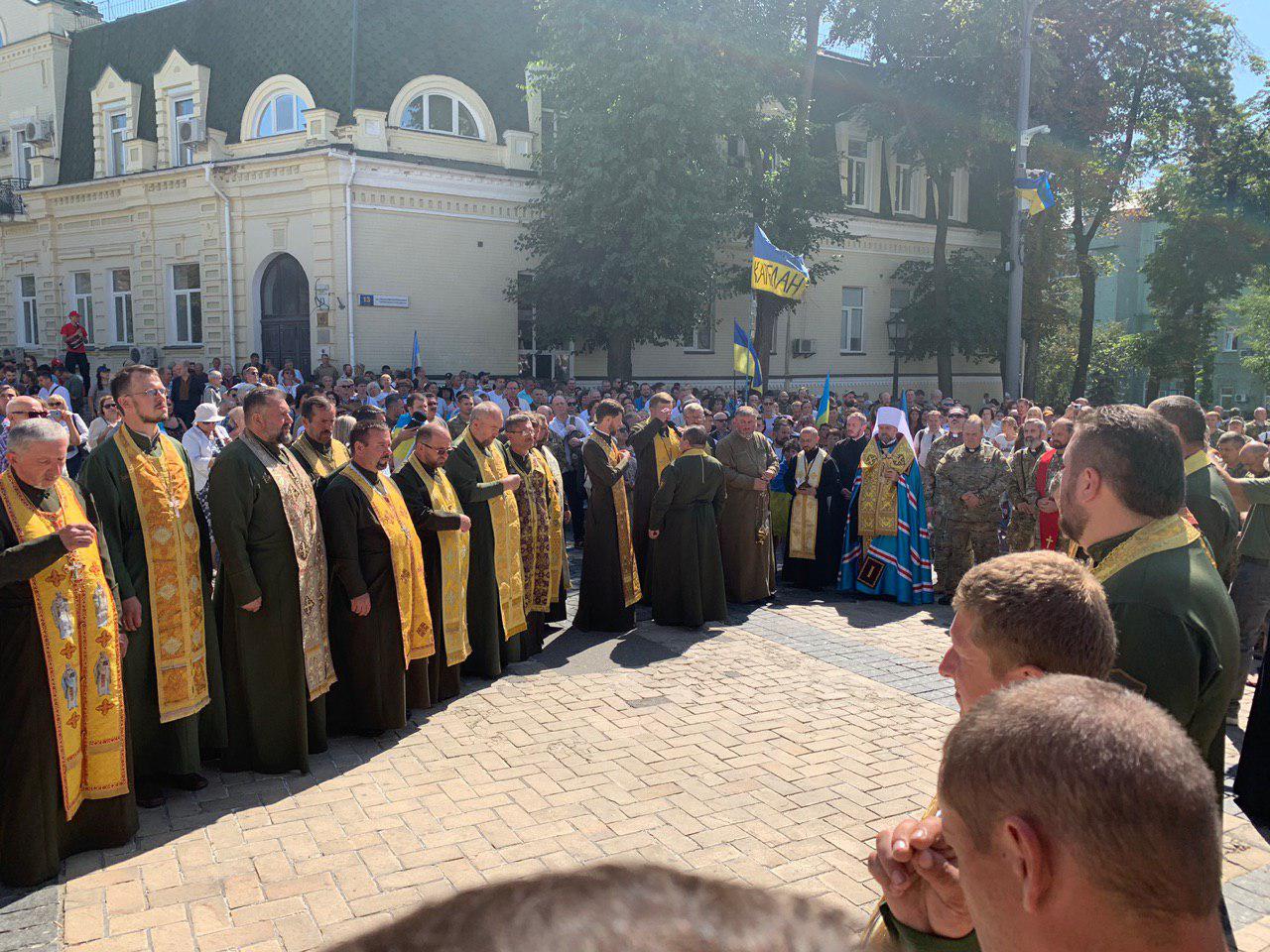 13:32 На Михайловской площади, куда двинулась часть участников марша ветеранов АТО Епифаний проводит молебен, вспоминая погибших защитников Украины. Это была Заупокойная молитва за героев, поникших при защите территориальной целостности Украины
