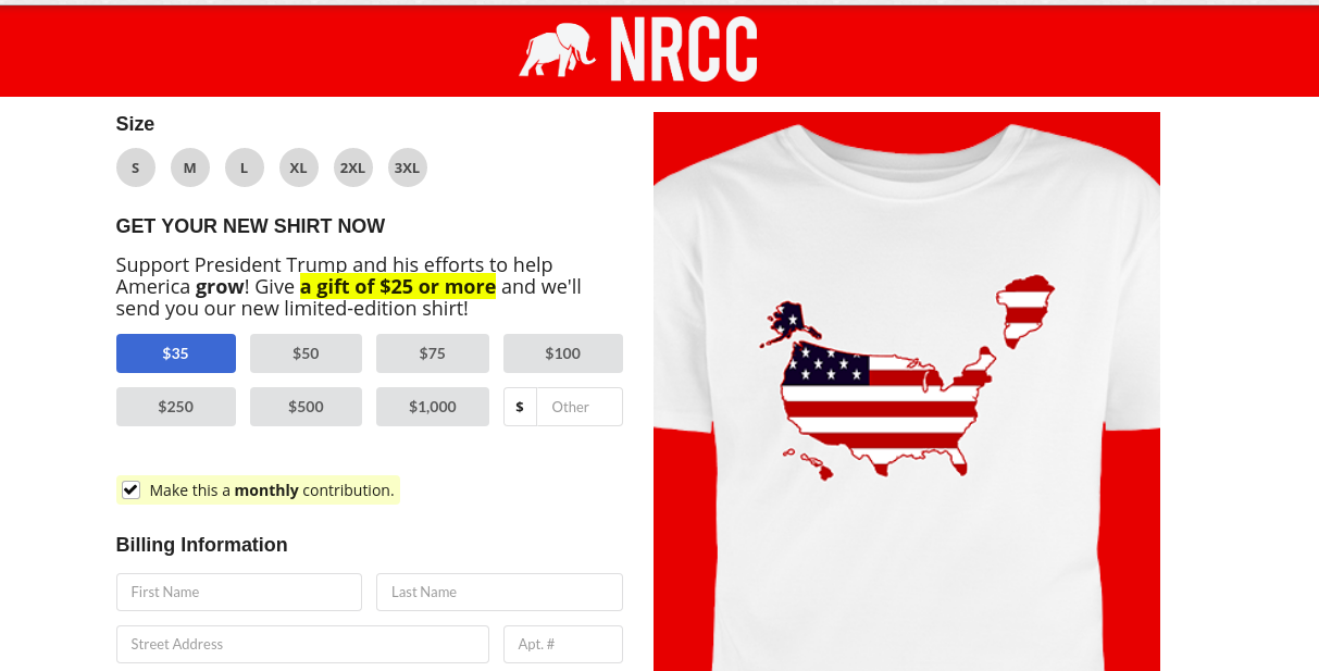 "Поддержи президента Трампа и его усилия, чтобы помочь Америке расти! Пожертвуй 25 долларов или больше, и мы пришлем тебе нашу новую футболку из ограниченной коллекции", - говорится в описании футболки на сайте комитета.