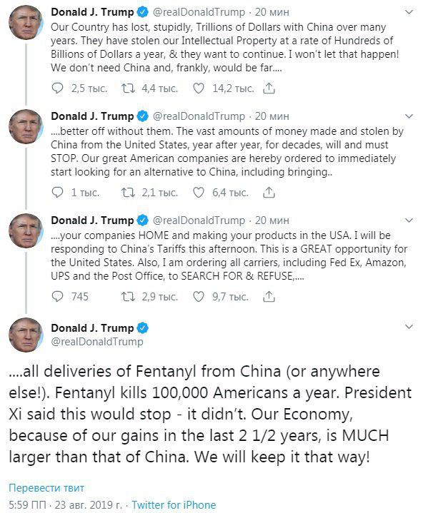 "Наша страна глупо теряла триллионы долларов из-за Китая многие годы. Они крали нашу интеллектуальную собственность стоимостью миллиарды долларов каждый год, и они хотят продолжать делать это. Я не позволю этому случиться. Нам не нужен Китай. Откровенно говоря, нам было бы намного лучше без них. Китай зарабатывал на Штатах и крал у нас год за годом, и этому необходимо положить конец...", - написал Дональд Трамп.