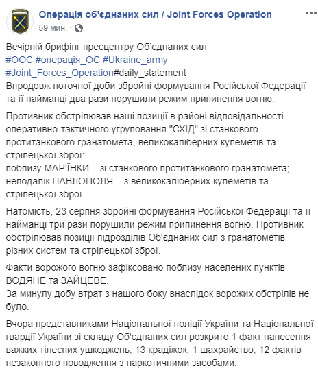 С начала текущих суток, 24 августа боевики на Донбассе два раза проводили обстрел позиций ВСУ. Потерь среди украинских военных нет, сообщает в Facebook сообщает пресс-центр операции Объединенных сил.