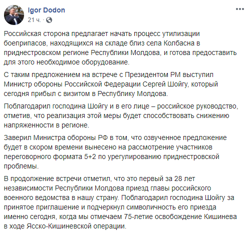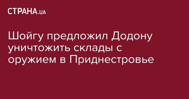 Министр обороны РФ Сергей Шойгу предложил президенту Молдовы Игорю Додону начать процесс утилизации боеприпасов, которые хранятся на складе недалеко от села Колбасна в Приднестровье. Об этом Додон написал в Facebook.
