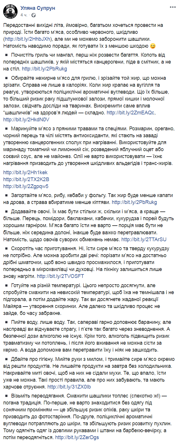 И.о. обязанности министра здравоохранения Украины Ульяна Супрун подробно проинструктировала жителей страны по поводу приготовления шашлыка. Соответствующий пост чиновница опубликовала на своем Facebook.