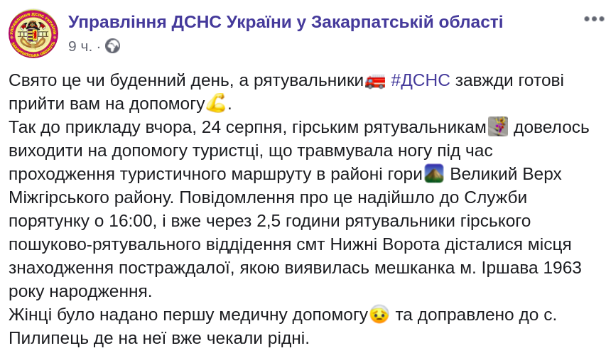 В субботу, 24 августа, горные спасатели должны были выйти на службу для того, чтобы помочь туристке, которая травмировала ногу во время прохождения туристического маршрута в районе горы Великий Верх Межгорского района. Об этом сообщает пресс-служба ГСЧС Украины в Закарпатской области в Facebook.