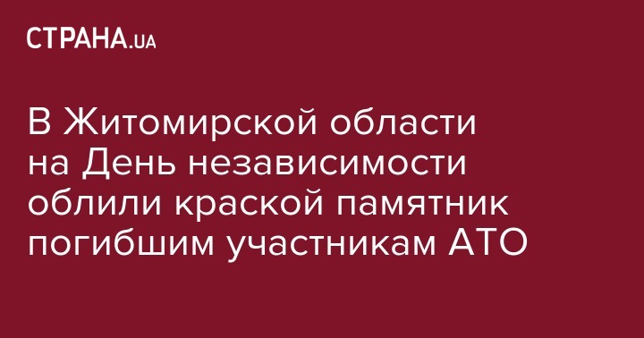 24 августа в поселке Озерное Житомирской области неизвестные облили красной краской памятник защитникам Украины, который там открыли накануне на День украинского флага.