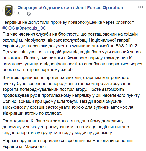 На блокпосту возле Мариуполя нацгвардейцы открыли огонь по колесам автомобиля, нетрезвый водитель которого пытался прорваться через шлагбаум. Об этом на Facebook сообщает штаб ООС.