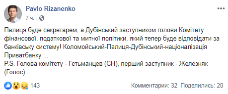 "Палица будет секретарем, а Дубинский заместителем председателя комитета финансовой, налоговой и таможенной политики, который теперь будет отвечать за банковскую систему! Коломойский-Палица-Дубинский-национализация Приватбанка... P.S. Председатель комитета - Гетьманцев (СН), первый заместитель - Железняк (Голос) ..." - написал Ризаненко.
