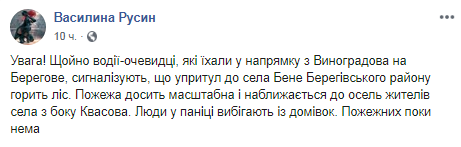 Пользователь Facebook Василина Русин сообщила, что у села Бене Береговского района горит лес и опубликовала снимки. Однако пресс-секретарь Закарпатского облуправления лесного хозяйства Юлия Давыдова заявила, что горит не лес, а кустарники и виноградники.