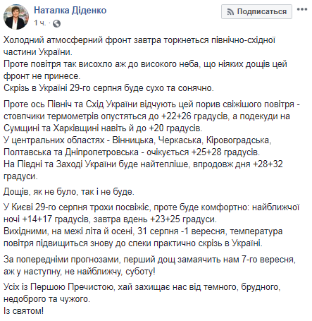 По данным Диденко, в целом в Украине в четверг, 29 августа, будет сухо и солнечно. Посвежеет на севере и востоке Украины. Столбики термометров опустятся до +22...+26 градусов, а в Сумской и Харьковской областях - до +20 градусов. В центральных регионах - Винницкой, Черкасской, Кировоградской, Полтавской и Днепропетровской областях - ожидается +25...+28 градусов. На юге и западе Украины будет теплее, в течение дня +28...+32 градуса.