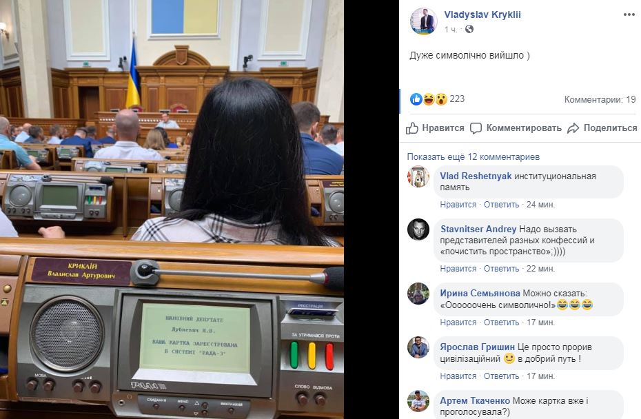 В частности, в 11:34 среды, 28 августа Криклий в Facebook опубликовал фото с "репетиции" заседания парламента. На нем запечатлен пульт для регистрации, в который "воткнута" персональная карточка нардепа.