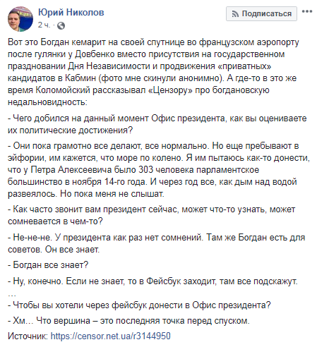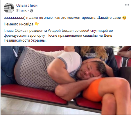"Вот это Богдан кемарит на своей спутнице во французском аэропорту после гулянки у Довбенко вместо присутствия на государственном праздновании Дня Независимости и продвижения "приватных" кандидатов в Кабмин", - написал Николов.