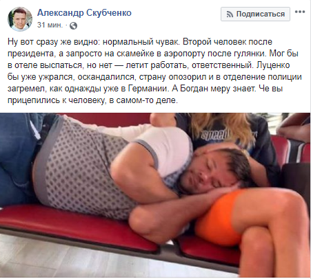 "...Второй человек после президента, а запросто на скамейке в аэропорту после гулянки. Мог бы в отеле выспаться, но нет - летит работать, ответственный. Луценко бы уже ужрался, оскандалился, страну опозорил и в отделение полиции загремел, как однажды уже в Германии. А Богдан меру знает. Че вы прицепились к человеку, в самом-то деле", - написал в Facebook журналист Александр Скубченко.