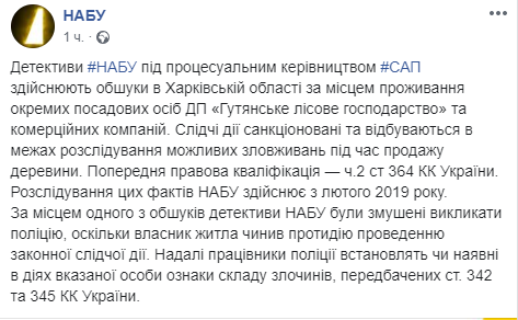 "Следственные действия санкционированы и происходят в рамках расследования возможных злоупотреблений при продажи древесины. Предварительная правовая квалификация - ч.2 ст 364 УК Украины. Расследование этих фактов НАБУ осуществляет с февраля 2019 года.