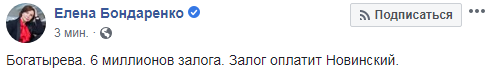 По информации на фейсбук-странице экс-нардепа от "Партии Регионов" Елены Бондаренко, эту сумму за Раису Богатыреву выплатит народный депутат Вадим Новинский.
