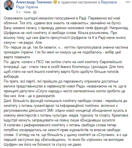 "Вижу много шума по поводу некоторых возможных председателей фракций. Например, Шуфрича во главе комитета по свободе слова. Несколько пояснений. При том, что сам факт присутствия Шуфрича и К в Раде меня мягко говоря - не радует.