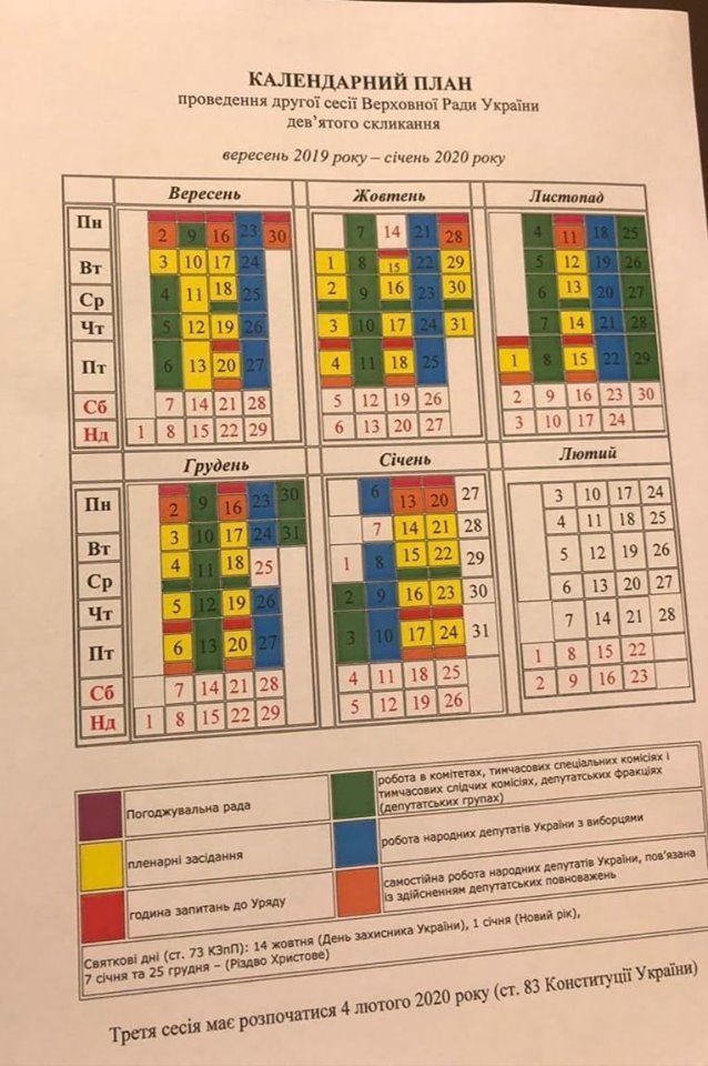 В четверг, 29 августа, в первый день работы нового созыва парламента Украины стал известен рабочий календарь народных депутатов до января 2020 года. Снимок опубликован на фб-странице политтехнолога Екатерины Одарченко.