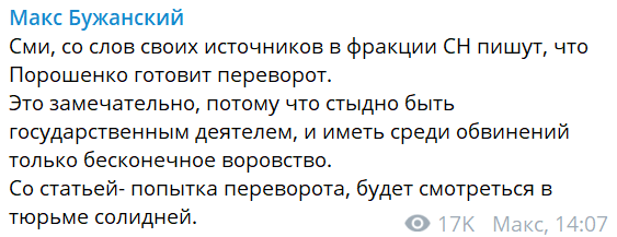 А вот депутат от "Слуги народа" Максим Бужанский не усомнился в позиции фракции, зато потроллил Петра Порошенко: