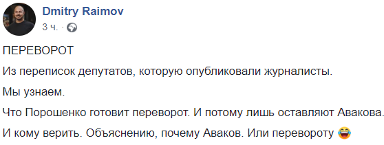 И кому верить. Объяснению, почему Аваков. Или перевороту?", - удивляется политтехнолог Дмитрий Раимов.